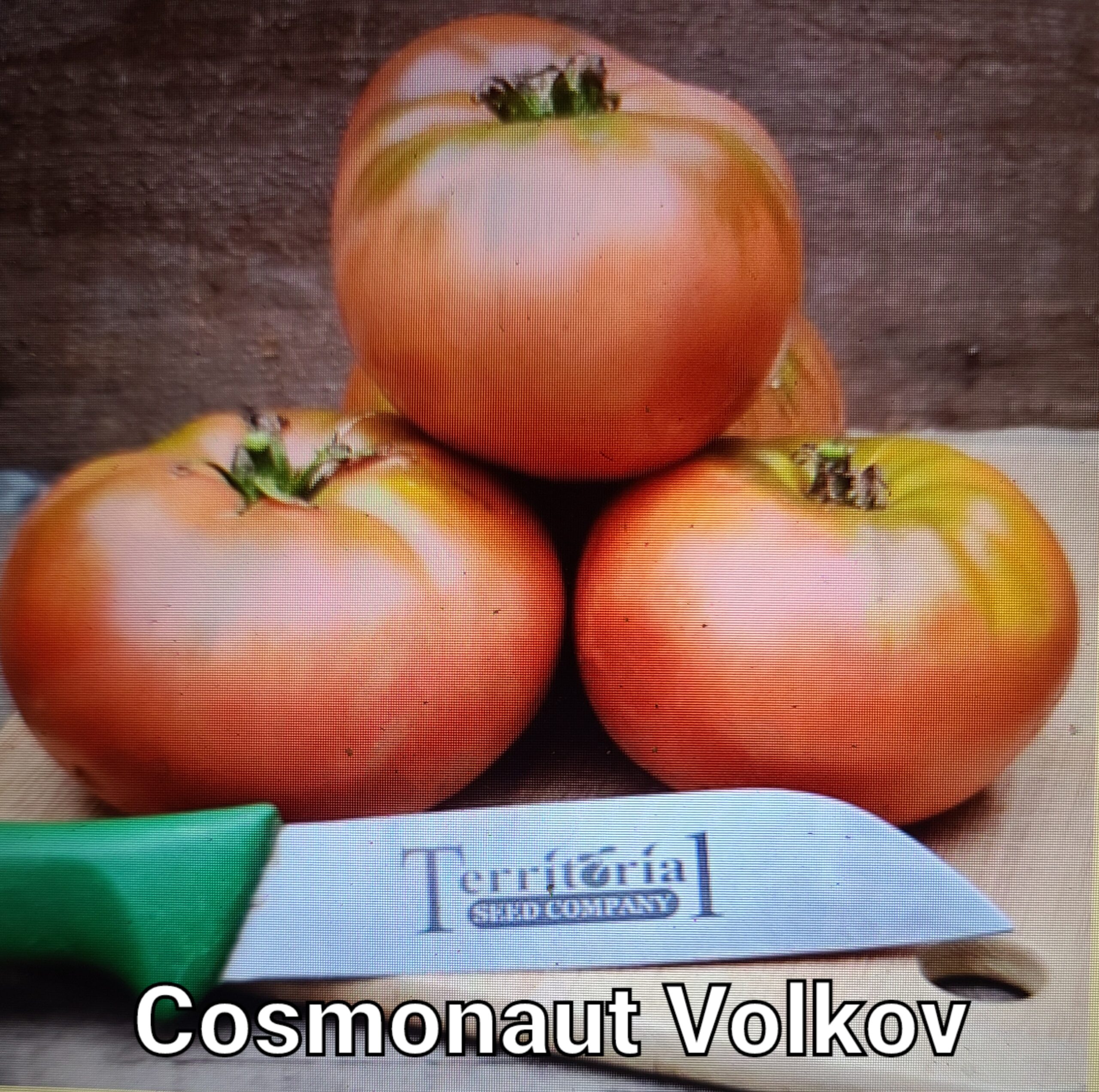 “Cosmonaut Volkov set our taste buds flying high with its rich, deep, balanced, sweet and tangy flavor. Determinate plants set generously sized, 2–3 inch, slightly squat, deep orange/red fruit with green-tinged shoulders, and bright red interiors. A taste sensation that only an heirloom can offer. Territorial Seed Company’s Great Northwest Tomato Taste-Off wiPicture and text from Territorial Seed Company.