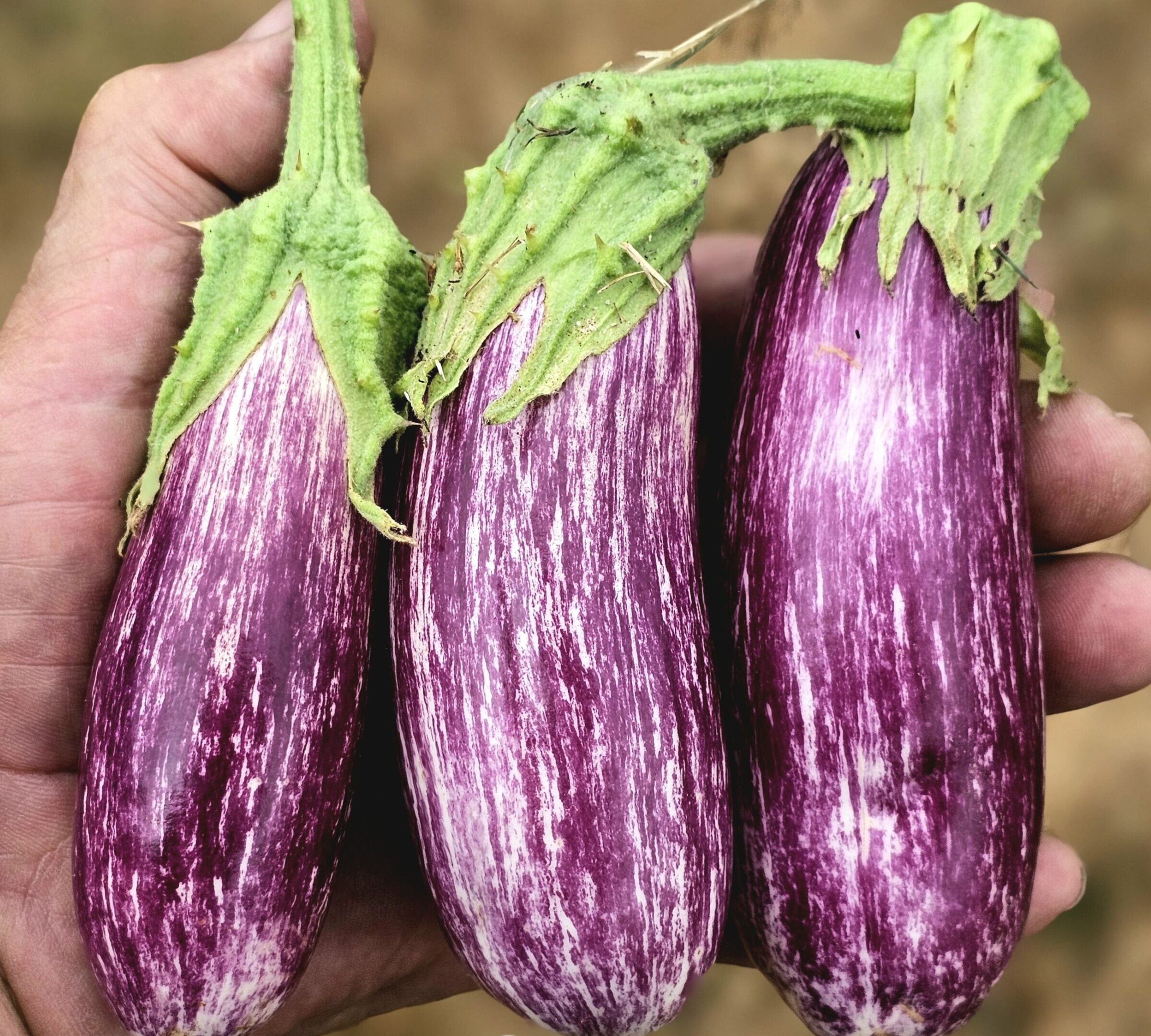 “Amazingly beautiful lavender-streaked fruits are 6-8 inches long, elongated teardrop shaped. Flesh is tender and mild, snow-white and bitter-free.” Text from Baker Creek Heirloom Seeds.
