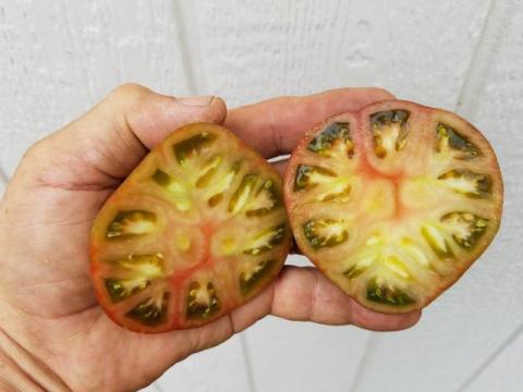 “What a gorgeous tomato. My first one coming out of the garden was all I needed to justify the name it was given. Colors of green, and red with the stripes very prominent make this one a visual winner. But the taste is the real bonus. You get rich tomato flavor with a good measure of sweetness. Didn’t find anyone who said they didn’t like it. I tried this one on BLT’s and they were great. Chopped up in a salsa, they really stood out. Salads were better both from the visual side and the taste side.as well. This is another one that didn’t seem to give any small fruits. All were the same size you see in the picture.” Muddy Bucket Farms