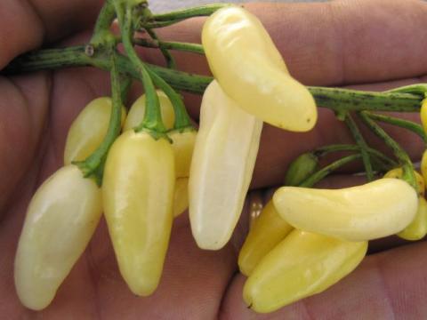 These creamy white ‘bullets’ have a nice fruity flavor and plenty of habanero heat. Maturing from pale green to almost florescent white, you’ll get loads of little 1-1½” extra-hot peppers to use as you would any other hab. Plant is bushy and very productive. An unusual shape and color for a habanero.