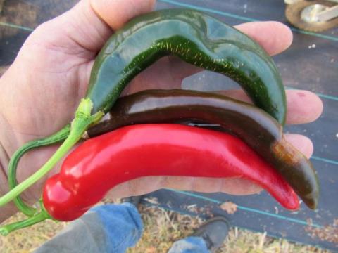 “Holy Mole! The Holy Mole is a F1 Pasilla-type All American Selection Pepper! This high yielding pepper is used for making mole sauces and different dips. This 8″ long pepper variety has a very tangy flavor. These compact 3′ tall plants are perfect for the patio. 1,300 Scovilles.” Text from the Urban Farmer.