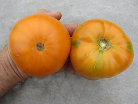 “Lovely, pale-orange fruits are solid and meaty throughout, packed with mild, superb-tasting flesh. A long-season producer of large, beefsteak-type fruits, up to 16 oz., with solid centers that have just a few seeds at the edges. Very desirable!” Totally Tomatoes