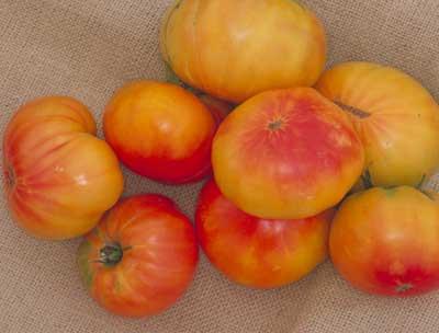 “This heirloom variety has become one of gardeners’ favorite bicolored tomatoes because of its hearty, size, and taste. Large yellow-orange fruit are streaked with ruby red and have a sweet, fruity taste that is absolutely delicious. Tomatoes weigh about 1 pound, although they often become 2 lbs. or even more. Large harvests on vigorous vines.” Text and picture from Tomato Growers Supply.