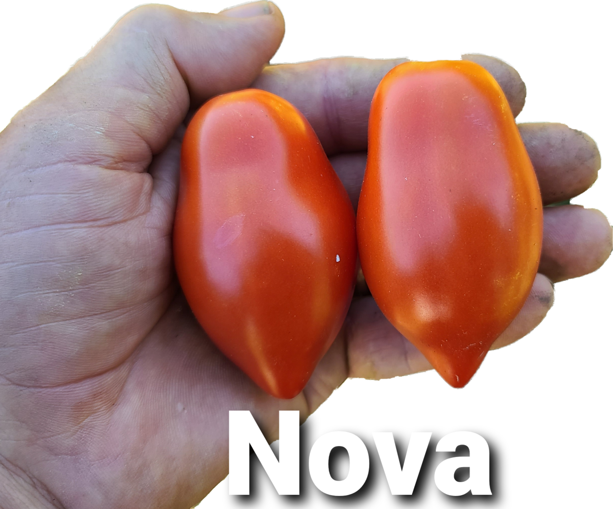 One of the earliest roma types to ripen in our trials, Nova exploded with fruit before most other saucing types. Meaty, lipstick red, 1 ½ inch by 2 inch fruit is elongated with a pointed end. Compact, determinate plants. Start your tomato canning and sauce making early with this delightful, excellent tasting tomato. Description from Territorial Seed Company.