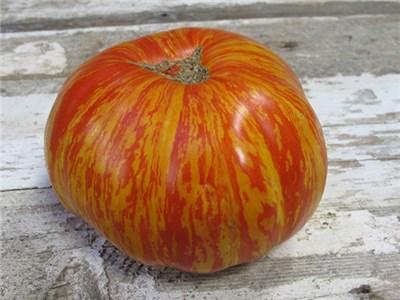 Red with gold stripes, very meaty flesh, luscious sweet tomato flavor