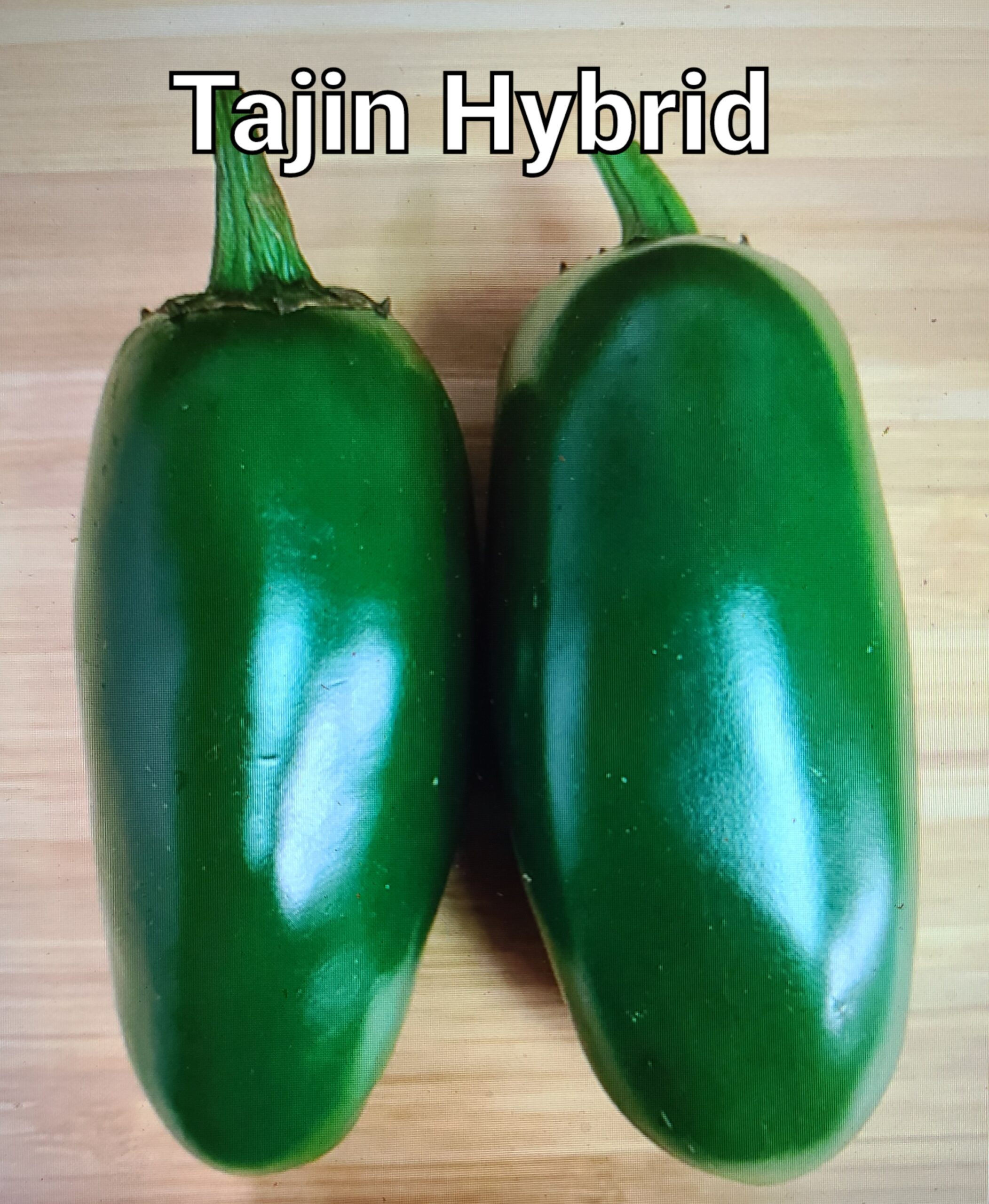 “Tajin produces excellent yields of 4 inch by 1.5 inch jalapeno fruit that are dark green in color. Pungency is medium to hot – 4,000 to 6,000 scovilles. 68 days.” Picture and text from Tomato Growers Supply.