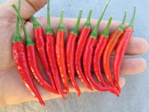 My favorite hybrid Thai, these plants grow vigorously and are very productive. Classic Thai peppers flavor and serious heat are what you get from these 2-3” skinny peppers. Use them fresh at any stage and dry easily when red ripe.