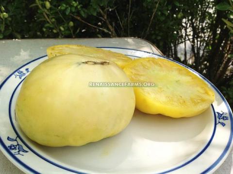 Tomatoes/Tomato Growers Supply 2007 catalog reads, “Creamy white color inside and outside make White Beauty a rarity. Extremely mild and sweet because of a high sugar content. Fruits average 8 ounces and are quite meaty with few seeds.” Picture from Renaissance Farms.